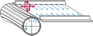 На рисунке 7 показан принцип действия механизма разделения листов при подаче их снизу стопы. В стопу из боковых направляющих подается сжатый воздух, который приподнимает листы вверх. В передней части стола расположен вращающийся барабан седловидной формы, имеющий продольные щелевые отверстия на своей поверхности. Внутри барабана создается вакуум, который способствует притягиванию к его поверхности нижнего листа бумаги. Этот лист, изгибаясь, увлекается барабаном вперед и подается в фальцующий механизм машины. Остальные же листы, расположенные выше него, отсекаются пластиной - ограничителем (на рисунке показан красным цветом). Для подстройки под тип и толщину бумаги современная фальцевальная машина должна иметь возможность регулировки величины раздува и вакуума, а также возможность изменения положения ограничителя, как минимум, в двух плоскостях (показано стрелками). За счет выключения раздува на одной из напр авляющих можно приспособить подающее устройство для работы с ранее сфальцованными листами. В этом случае напор воздуха, подающийся только со стороны фальца, не позволяет сложенному листу раскрыться и застрять под пластиной - ограничителем.