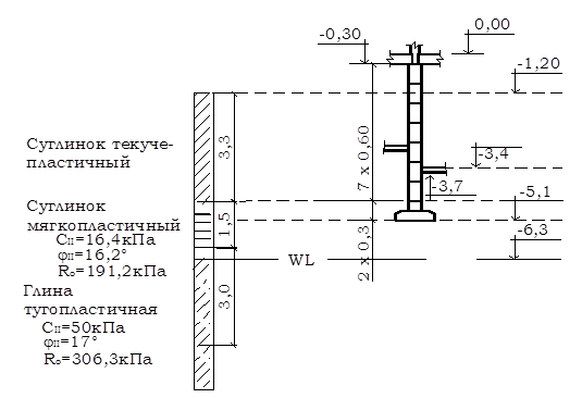 Необходимо учитывать и тот факт, что заглубление подошвы фундамента ниже WL также нежелательно, т.к. возрастает трудоемкость и стоимость работ по устройству фундамента. Следовательно, основание фундамента – 2-ый слой суглинок мягкопластичный.