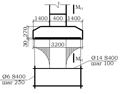 Принимаем арматуру Æ16 S400(As=20,1см2) с шагом 100мм. Распределительную арматуру принимаем Æ6 S400 с шагом 250мм.