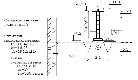 ) и конструктивных особенностей фундамента (Принимаем фундаментную плиту высотой 0,3м и три фундаментных блока высотой 0,6м. Причем фундамент выступает над планировочной отметкой на высоту 1,2м.). Исходя из выше изложенных условий принимаем глубину заложения фундамента на расстоянии 3м от планировочной отметки.