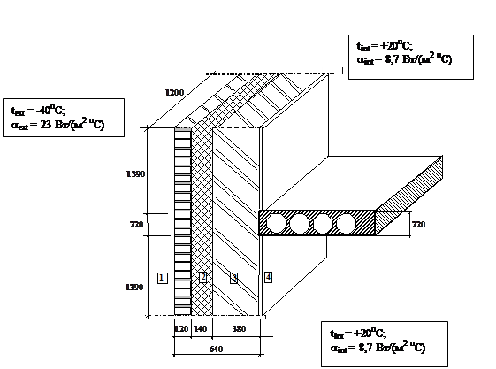 Рис.2.6. Схема задания граничных условий фрагмента наружной стены для определения приведенного сопротивления теплопередаче