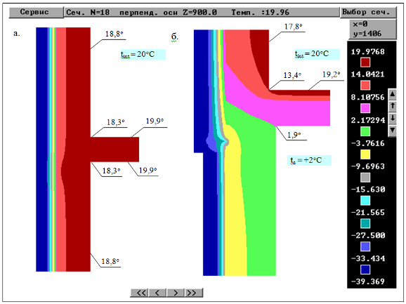 Рис.3.1. Результаты расчета распределения температур: а- узла сопряжения глухого участка наружной стены с плитами перекрытия, б- узла сопряжения цокольного участка наружной стены с плитами перекрытия