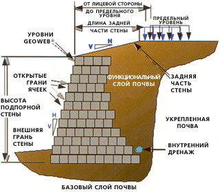 Георешетка, применяемая в строительстве подпорных стен, позволяет решать проектные проблемы, особенно, когда фундамент состоит из сжимаемых нестабильных грунтов.