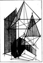 При измерении соотношений трех типовых состояний объемно-пространственной формы обнаруживается возможность перехода от объема к плоскости, от плоскости к линии.