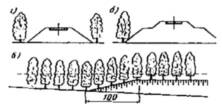Для повышения уверенности вождения автомобиля рекомендуются аллейные посадки у подошвы насыпей высотой 6-9 м и на бермах, устраиваемых на откосах насыпи высотой более 10 м. При этом предпочтительны деревья с неглубокой, но развитой корневой системой (см. рис. 2, 3).