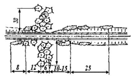 В открытой местности по концам выемок в тех местах, где их устраивают раскрытыми из-за малой глубины и соображений снегоборьбы, следует размещать комплексные посадки (кулисы) из 7-8 деревьев и кустарника с каждой стороны, на остальном протяжении откосов выемки в открытой местности размещают однопородные группы кустарника с шагом от 40 до 70 м (рис. 5).