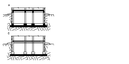 – массивные плитные (предпочтительно повышенной жесткости, в т.ч. коробчатые с развитой подземной частью) на естественном или укрепленном основании.