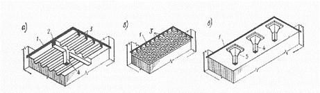 а — ребристое, 6— кессонированное, в — безбалочное 1 — плита, 2 — главная балка(ригель)