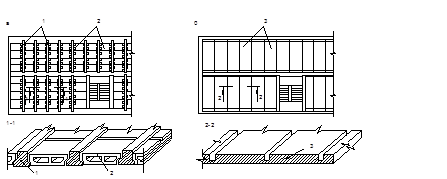 а—балочные; б — плитные; 1 — балки; 2 — межбалочное заполнение; 3 — плиты