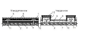 1 — балки; 2 — гипсобетонная плита; 3 — промазка щелей раствором или подстилка толя; 4 — усиление изоляции воздушного шума (песок); 5 — изоляция ударного шума (упругие прокладки); 6 — пол по лагам; 7 — пароизоляция; 8 — теплоизоляция; 9— стяжка; 10 — затирка; 11 — металлическая сетка; 12 — деревянный короб