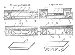 а —виды несущих плит; б— конструкции перекрытий; 1 — сплошная плита (Y=400 кг/м2); 2 — круглопустотная; 3 — ребристая; 4 — типа ТТ; 5 — изоляция ударного шума; 6 — пол по стяжке; 7 — усиление изоляции воздушного шума (гипсобетонные плиты по лагам); 8 — пол; 9 — пароизоляция; 10—теплоизоляция; 11 — стяжка.