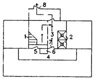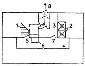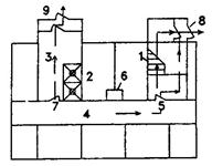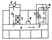 а - план типового этажа; б - план первого этажа; 1 - незадымляемая лестничная клетка 2-го типа; 2 - лифтовые шахты; 3 - лифтовый холл; 4 - коридор; 5 - принимаемая в расчет открытая дверь на этаже пожара; 6 - шахта дымоудаления; 7 - дверь закрытая при пожаре; 8 - наружная дверь для выхода из здания; 9 - наружная дверь закрытая при пожаре