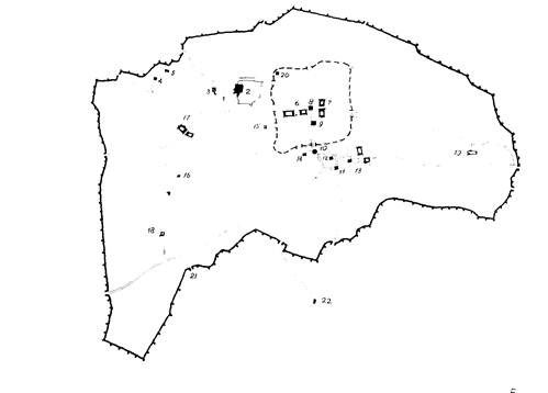 1. Бухара - Схематический план города: 1 — Регистан, 2 — Арк, 3 — мечегъ Волохауз, 4 — мавзолеи Исмаила Самани, 5 — мавзолей Чашма-Аюб. 6 — мечеть Калян и медресе Мири-Араб. 7 — медресе Улугбека и Лябдулазисхана. 8 — Токи Заргарон. 9 — Тим Абдуллахана, 10 — Токи Тильпак-срурутон. 11 — Токи Саррафон. 12 — мечеть Магоки Аттари, 13 — площадь Ляби-Хауз, 14 — мечеть Магоки-Курпа, 15 — мечеть-ханака Ходжа Зайнеддина. 16 — мечеть 13алянд, 17 — Кош медресе. 18 — медресе Джуйбари Калян, 19 — медресе Чор-мипор. 20 — зиндан, 21 — порота Шейх-Джалаль, 22 — мечеть Намазго