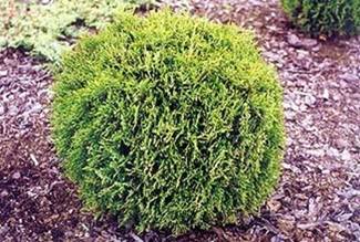 Небольшими темно-зелеными шариками туя западная «Глобоза» также вписывается во всевозможные композиции. Это медленнорастущий сорт с годовым приростом в высоту и ширину примерно 5см. При нормальных условиях сорт сохраняет форму в течение всей жизни. В 5-и летнем возрасте высота туи «Глобоза» примерно 30см, диаметр кроны таких же размеров. К 40-а годам ваши туи при высоте 1,5м достигнут диаметра шаровидной кроны −1,5м.