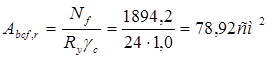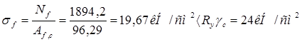 Суммарная площадь сечения накладок нетто больше, чем сечение пояса, поэтому проверку на прочность выполняем только послабленному сечению пояса. Поскольку A f,n = 81,6 см2 < 0,85Af = 0,85*100 = 85 см2, то проверка производится по условной площади A f,c = 1,18*A f,n = 1,18*81,6 = 96,29 см2 (см. п. 11.14 [1]).