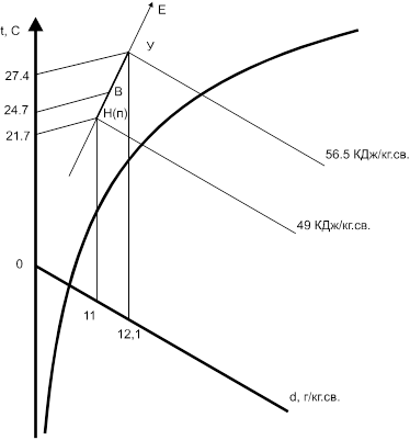 1. т.Н (dн=10,9 г/кг; tн=23,6 °С; Iн=51,0 кДж/кг; j= 60%).