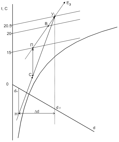1. т.Н (dн=5,17 г/кг; tн= 8 °С; Iн= 22,5 кДж/кг).