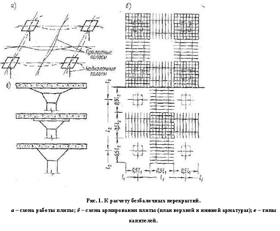 Безбалочные перекрытия были первой, так сказать истинно железобетонной, конструкцией. Разделение ребристого перекрытия на этажно опёртые друг на друга элементы – плиту, второстепенную балку, главную балку, колонну – свойственно сборности стали или дерева. В железобетоне такое разграничение функций хоть и общепринято, но противоестественно. Железобетонную плиту за счет приопорных утолщений можно превратить в активный конструктивный элемент, приближающийся по распределению внутренних усилий к системе пологих оболочек, что побудило отдельных авторов так именно её и рассматривать.