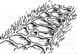 Также для прохода через газон или в саду можно выложить тропинку из камней, расположенных друг от друга на расстоянии шага (примерно 65 см). Такие дорожки еще называют римским тротуаром (рис. 2). Все дорожки из плит делают нейтрального цвета (кремовые, сероватые, коричневатые). Толщина плит должна быть не менее 5 см. Если дорожка проходит по клумбе, уровень камней надо поднять на 3—4 см выше уровня почвы (уровень почвы будет с каждым годом повышаться, а вода должна стекать с дорожки). В настоящее время многие железобетонные заводы стали выпускать тротуарный камень. Это изделия, выполненные из бетона методом вибропрессовки с расцветкой под натуральный камень. Обычно на рынке предлагают камень 6-9 оттенков и 5-8 типоразмеров (это различные прямоугольники, квадраты и более сложные формы, отлично складывающиеся в плоскости, как хорошая мозаика). Конечно, дорожки и площадки, выполненные из такого материала, смотрятся идеально, но многих застройщиков пугает довольно высокая цена. В принципе, более обеспеченным хозяевам стоит обратить внимание на покрытие дорожек из настоящего природного камня (гранит, диабаз, базальт . мрамор, в конце концов). На рынке строительных товаров можно увидеть тротуарное покрытие из этих материалов.