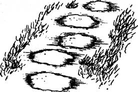 Для прохода через газоны лучше всего использовать покрытие из бетонных плит округлой, квадратной или неправильной формы. Пример дорожки из каменных плит показан на рис. 1. Плиты располагают на газоне на расстоянии 15-25 см одна от другой согласно задуманному рисунку. С помощью лопаты намечают контур каждой из них. Затем снимают слой дерна и укладывают плиты так, чтобы они располагались на уровне поверхности лужайки. Для выравнивания, закрепления и установки нужного уровня под плиты подсыпают грунт или песок.