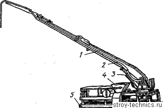 Рис.6. Бетононасос СБ-95А с гидравлическим приводом:1 — распределительная стрела, 2 — бетоновод, 3—гидроцилиндр, 4—приемная воронка, 5—рама.