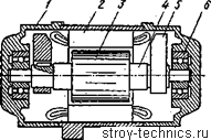 Рис.7. Дебалансный вибровозбудитель: 1 — корпус вибратора, 2 — статор электродвигателя, 3 — ротор электродвигателя, 4 -— вал электродвигателя, 5 — дебаланс, 6 — шарикоподшипник