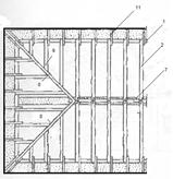 Рисунок 2.6, 2.7 – Расположение наслонных стропил 1- чердачное перекрытие,2- мауэрлат, 3- стропильная нога ,4 – лежень ,5 – подкос, 6- стойка через 3-5м, 7- прогон, 8- накосная стропильная нога ,9- нарожки ,10 – подкос под прогон, 11- кобылка.