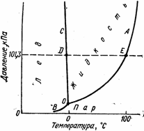 На рисунке приведена в схематической форме (без строгого соблюдения масштаба) диаграмма состояния воды. Любой точке на диаграмме отвечают определенные значения температуры и давления.