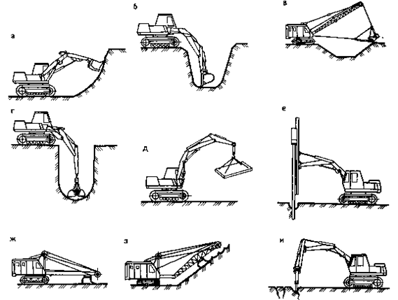 Рис. 7. Одноковшовые экскаваторы со сменным рабочим оборудованием: а—прямая лопата; б—обратная лопата; в—драглайн; г—грейфер; д—кран; е—сваебойный копер; ж—струг; з—планировщик откосов; и—рыхлитель грунта.