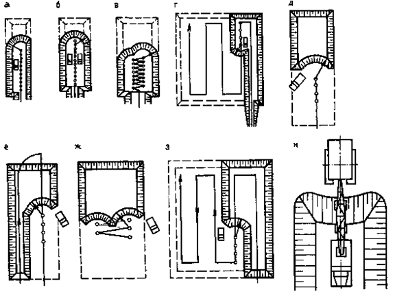 В боковом забое (рис. 8,г) экскаватор разрабатывает грунт по одну сторону от оси проходки и грузит его на транспортные средства, подаваемые по другую сторону.