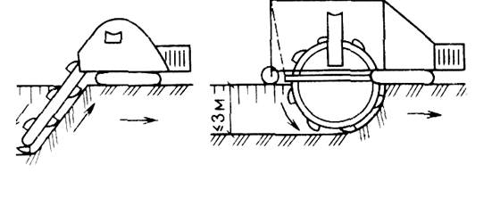 Обратной лопатой экскаватор разрабатывает грунт «на себя» с торцовой или боковой проходкой. При торцовом забое (рис. 8,д,е,ж) экскаватор перемещается по оси отрываемой им траншеи или котлована, попеременно разрабатывая грунт то с одной, то с другой стороны в зависимости от того, куда подходят транспортные средства. Если грунт разрабатывают с одной стороны оси движения экскаватора, то образуется боковой забой (рис. 8,з).