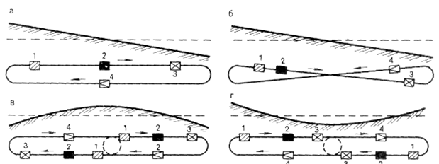 Рис. 10. Схема разработки грунта скреперами а—проходка по эллипсу; б—то же, по восьмерке; в—сдвоенная проходка по эллипсу при двух насыпях; г—то же, при двух выемках; 1—участок загрузки; 2—груженый скрепер; 3—участок разгрузки; 4—порожний скрепер