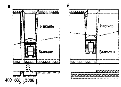В первом случае ярусы глубиной 400 .500 мм разрабатывают траншеями шириной в отвал бульдозера, оставляя между ними нетронутый грунт полосами 400 .600 мм (рис. 11,а). Их срезают бульдозером в последнюю очередь.
