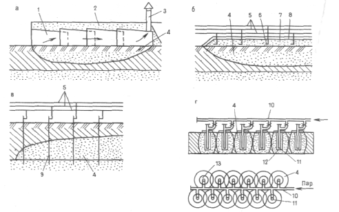 Рис. 16. Схема оттаивания мерзлого грунта: а—огневым способом; б—электропрогревом с использованием горизонтальных электродов; в—то же, с использованиев вертикальных электродов; г—паронагревом; 1—секция короба; 2—утеплитель; 3—вытяжная труба; 4—оттаявший грунт; 5—трехфазная электрическая сеть; 6—горизонтальные полосовые электроды; 7—слой опилок; 8—слой толя или рубероида; 9—стержневой электрод; 10—порапровод; 11—паровая игла; 12—пробуренная скважина; 13—колпак.