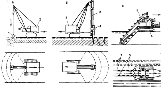 Рис. 17. Схема рыхления грунтов: а—клин-молотом; б—дизель-молотом; в—многоковшовым экскаватором, оборудованным режущими цепями-барами; 1—клин-молот; 2—экскаватор; 3—направляющая штанга; 4—дизель-молот; 5—режущие цепи (бары); 6—многоковшовый экскаватор; 7—щели в мерзлом грунте