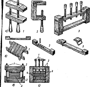 Наряду со склеивание по длине и ширине бруски и доски склеиваются по пласти. Этот вид соединение является основным при изготовлении строительных клееных конструкций.
