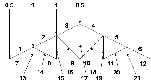 Расчет выполняется на единичных нагрузках, приложенных к половине фермы.
