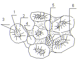 1-глинистые частицы,2-адсорбированная вода,3-диффузионная вода,4-воздух,5-тве- рдая частица,6-свободная влага.