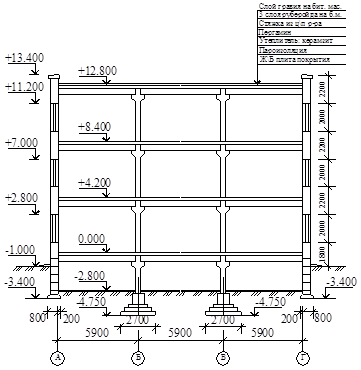 Ригели поперечных рам – трёхпролётные, на опорах жёстко соединены со средними колоннами, на стены опёрты шарнирно. Плиты перекрытий предварительно напряжённые многопустотные номинальной шириной 1900 мм и 2100 мм; связевые плиты номинальной шириной 2100 мм размещают по рядам колонн.