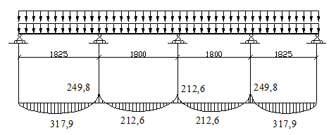 Изгибающие моменты балки определяем как для многопролётной неразрезной балки шириной 100 см с пролётами, равными шагу второстепенных балок с учётом перераспределения моментов.