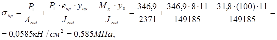 Проверим, образуются ли начальные трещины в верхней зоне плиты от усилия предварительного обжатия.