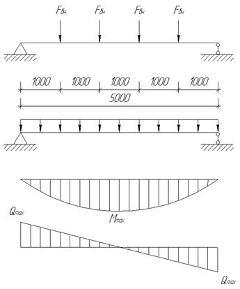 Нагрузка с балок настила передаётся на вспомогательные балки в виде сосредоточенных сил. При частом расположении балок настила (4 и более) можно заменить сосредоточенные силы эквивалентной равномерно распределённой нагрузкой.
