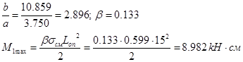 Максимальный изгибающий момент на единичную полосу торцевой диафрагмы, как пластинки, опертой по трем сторонам, с соотношением размеров bд /aд =4.000, при котором численный коэфициент b = 0.133: