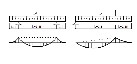 При транспортировании под колонну кладем 2 подкладки на одинаковом расстоянии от торцов. Тогда в сечении колонны под подкладками и в середине пролета между подкладками нагрузка от собственной массы колонны вызовет изгибающие моменты: