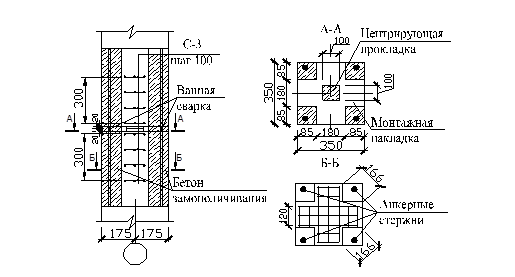 Стык колонн осуществляем на ванной сварке выпусков стержней с обетонированием. В местах контактов концентрируются напряжения, поэтому торцевые участки усиливаем косвенным армированием. Последнее препятствует поперечному расширению бетона при продольном сжатии.