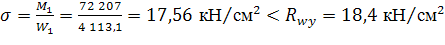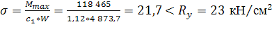 Проверяем максимальные нормальные напряжения в поясах в середине балки: