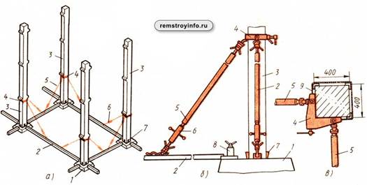Рис. 1 - Схемы установки многоэтажных колонн с помощью комплекса индивидуальных средств монтажной оснастки: а - расположение колонн и приспособлений, б - закрепление колонны подкосами, в - хомут для закрепления подкосов к колонне; 1 - стакан фундамента, 2 - инвентарная балка, 3 - колонна, 4 - хомут, 5 - подкос, 6 - фаркопф подкоса, 7 - клинья, 8 - анкерное устройство, 9 - обжимный канат