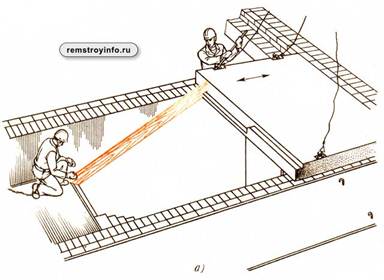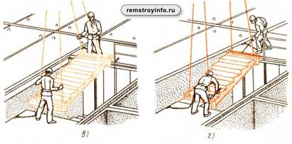 После установки маячных плит натягивают проволочный шнур-причалку по их наружному верхнему ребру на длину всей захватки и по нему устанавливают остальные плиты. Плиты стропят обычно четырехветвевым стропом. Растворную постель разравнивают кельмой, не доводя на 2 . 3 см до обреза стены.