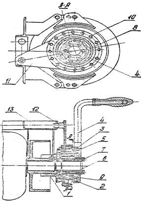 Безопасная рукоятка (рис.4) состоит из рукоятки роликовой муфты свободного хода и стопорного рычага. Ступица 1 смонтирована на подшипнике 2, в разъемном корпусе 3. Вращение ступицы 1 рукояткой 4 производится через двухстороннюю роликовую обгонную муфту. Муфта состоит из наружной обоймы 5, внутренней обойму 6, связанной со ступицей болтами 7. Четыре ролика 8 уложенные на кольцо 9 между наружной и внутренней обоймами подпружены гильзами 10. Корпус 3 удерживается от вращения стопорным рычагом 11, палец которого входит в одно из отверстий рамы тормоза 13.