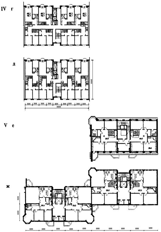 IV - шестиквартирная секция универсальной ориентации с двухуровневыми квартирами; г, д - планы этажей;